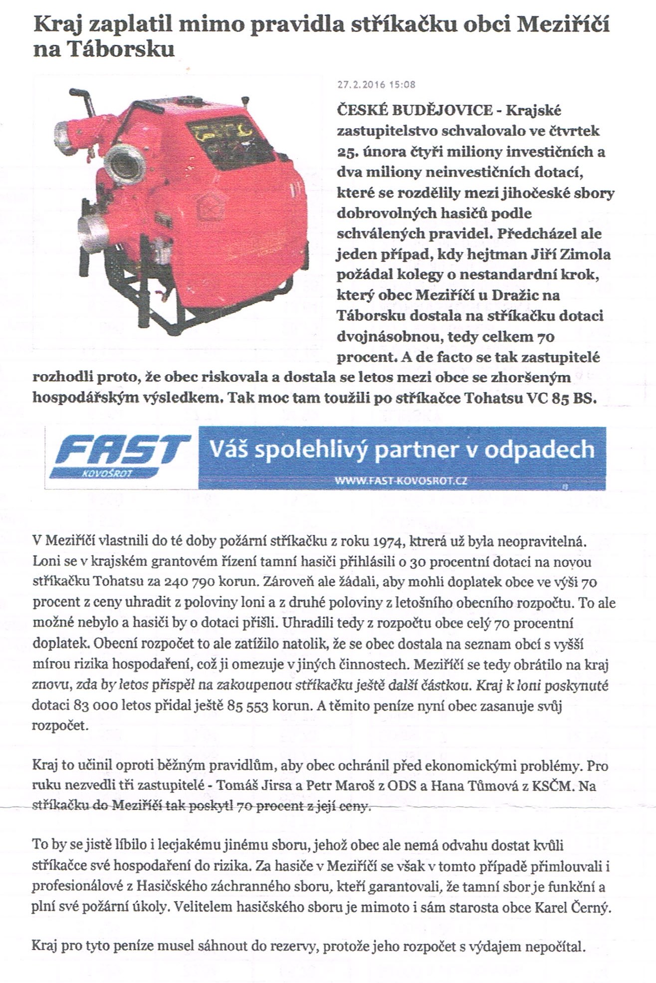 Začátkem roku obec podala individuální žádost o účelovou investiční dotaci z rozpočtových prostředků Jihočeského kraje na pořízení požární stříkačky TOHATSU VC85BS. Stříkačka byla zakoupena již v loňském roce (viz. níže) z jiného grantového programu JK, ale výše podpory byla nízká, jen ve výši 30%. Individuální žádost byla podpořena a obec získala další dotaci na její pořízení ve výši 85.553 Kč, a tak nakonec dotace pokryjí 70% vynaložených nákladů. JSDHO Meziříčí je tak opět akceschopná.