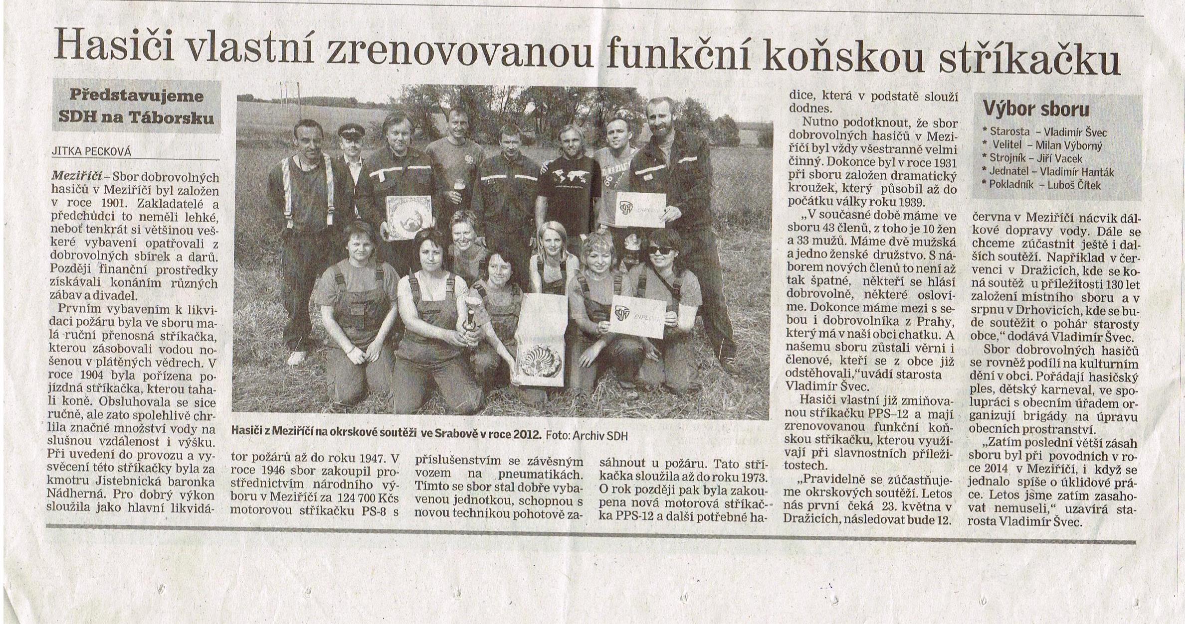 Letos se okrsková hasičská soutěž konala v Dražicích. Meziříčí reprezentovala tři družstva - ženy I, muži I a muži II. Družstva ve svých řadách přivítala nové soutěžící - naše nejstarší "děti". Dali jsme do toho všechno, dokonce došlo i na zranění, ale na "bedně" stáli jen naši Muži II, kteří obsadili třetí místo. Vše proběhlo jak má, ale naše stříkačka z roku 1974 těm novým nemůže konkurovat, takže jsme vodu k proudnicím opět tlačili očima. Bez nové stříkačky asi lepší výsledky nebudou, starosto :o). Uvidíme, jak dopadneme příští rok v Radkově.